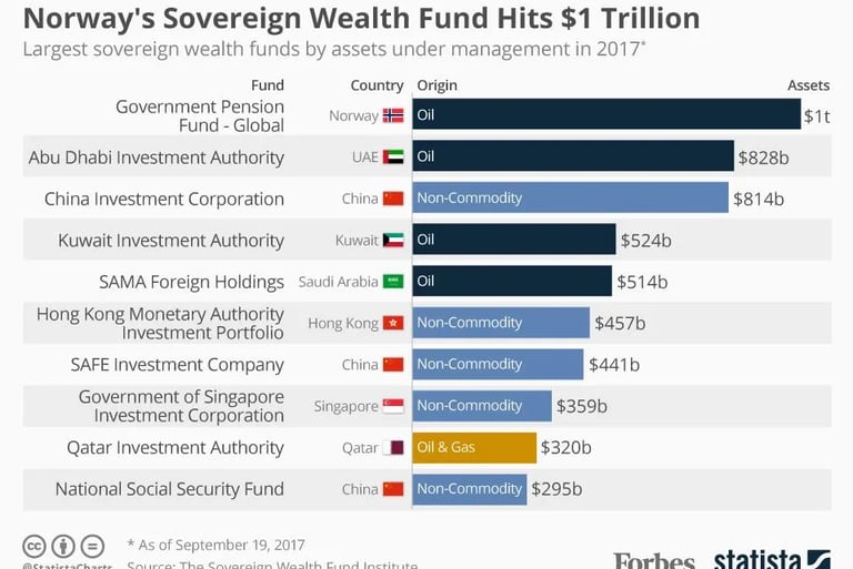 O fundo soberano da Noruega é hoje o maior fundo soberano do mundo. Ele investe em mais de 70 países, seguindo critérios rígidos de governança e transparência.