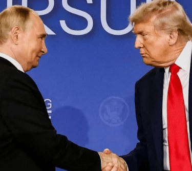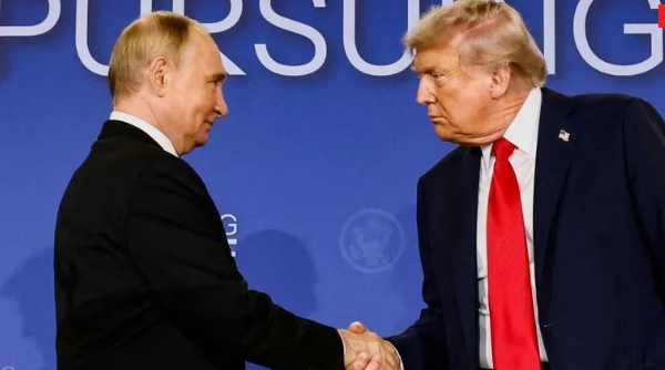 Presidentes da Rússia, Vladimir Putin, e dos EUA, Donald Trump, cumprimentam-se durante encontro no Alasca • 15/08/2025 REUTERS/Kevin Lamarque